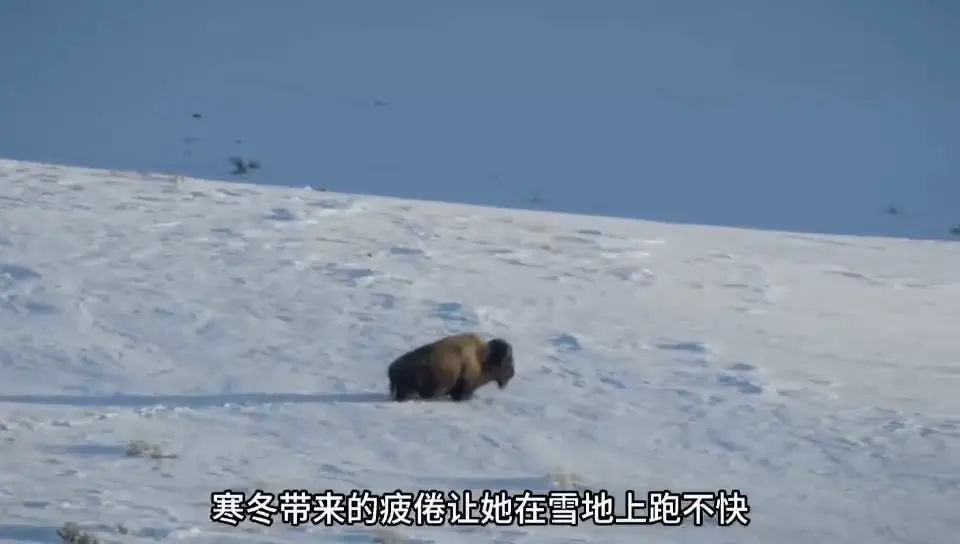 这头野牛要出事了,在它背后有一群狼正在追杀它。酷寒带来的疲顿让它在雪地上跑不快,狼群眷属依然追逐上来。落单野牛的体重尽管是灰狼的10倍以上,但是灰狼捕猎频繁以群体合营,哪怕再广阔的猎物,它们都有这个实力将其放倒。